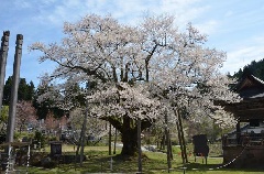富山県の天然記念物に指定されている「明日(あけび)の大桜」はエドヒガンの老樹で、例年4月上旬から中旬にかけて美しく咲き誇ります。毎年4月第3日曜には、「越中の稚児舞」として国の重要無形民俗文化財に指定されている「明日の稚児舞」が、大桜の前庭にある舞台で奉納されます。