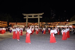 広島護国神社に祀られた英霊を慰めるため、境内に2000灯余りの提灯を掲げてお祭りが行われます。30日の夜には、巫女姿の未婚女性によるみこ踊りの奉納とよさこい踊り陣「叶和」の披露、31日には、子供ずもう大会や神楽共演大会などが催されます。