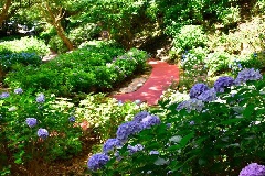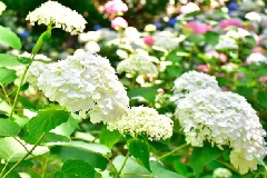 ニューヨークランプミュージアム&フラワーガーデンのあじさい苑では、例年5月下旬から6月下旬にかけて、色とりどりのアジサイが見頃を迎えます。城ヶ崎海岸に自生するガクアジサイの八重咲き種「城ヶ崎」や「伊豆の華」など、日本原種のアジサイをはじめ、人気の「ダンスパーティー」や「アナベル」などの改良品種も合わせ、200種以上のアジサイが次々と開花します。楚々とした姿が特徴の日本原種のアジサイと、色鮮やかな園芸品種の競演を楽しむことができます。