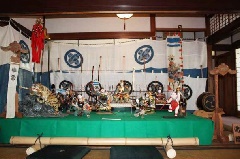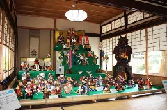 五個荘の近江商人屋敷(外村繁邸、中江準五郎邸、藤井彦四郎邸)と、金堂まちなみ保存交流館で、江戸時代から伝わる加藤清正と虎など、勇壮な武者人形をはじめとする約50組が展示されます。近江商人たちが残した蔵や屋敷が数多く現存する五個荘に、初夏をもたらす行事として親しまれています。