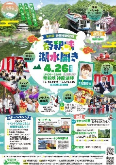 国定公園帝釈峡の観光シーズンの幕開けに、神龍湖畔でアウトドアイベントが行われます。カヤックやツリーイングなどのアウトドア体験が楽しめるほか、食のブースも出て、地元産の食材を使った料理が味わえます。神龍湖は、上空から見ると龍の姿に似ていることから名付けられた、周囲24km、全長8kmの人造湖で、3つの橋(紅葉橋、神龍橋、桜橋)を渡って湖を1周する散策コースが整備されているほか、遊覧船からは両岸にそびえる断崖や奇岩を楽しむことができます。