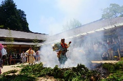 人々のさまざまな願いを書いた護摩木を護摩壇へ投げ入れ、修験の修法により不幸不運を焼き払い、幸運を招く神事が宝満宮竈門神社で行われます。古来よりの装束に身を固めた山伏により、「山伏問答」、「壇作法」、「護摩供」と、古式の通りに採燈大護摩供が執り行われます。それが終わると護摩壇が崩され、老若男女が除災招福を祈って火渡りを行います。