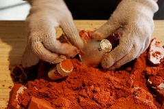 空気が動けば吹き飛ぶような極薄の金箔を工芸品に貼りつける金箔貼り体験が、金沢市…