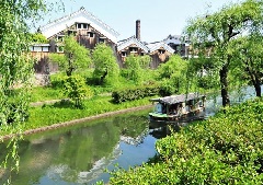 宇治川派流と濠川をゆったりと下る屋形船の十石舟。柳並木や酒蔵など、歴史的な風情…