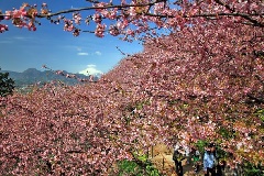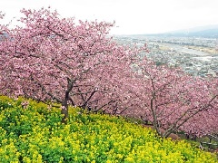 松田山の斜面にある西平畑公園では、例年2月になると河津桜が見頃を迎えます。四方を桜に囲まれた約300m続く散策路では、さながら桜のドームにいるかのようです。見晴台では、眼下に広がる景色と桜を背景に、記念写真を撮影するのもお勧めです。散り始めには、運が良ければ、高台ならではの「吹き上げる桜吹雪」に遭遇することも。ふるさと鉄道に乗って桜のトンネルをくぐったり、ブランコ「スカイウィング」から桜と富士山の絶景を堪能したり、西平畑公園ならではのお花見が楽しめます。グルメや地場産品のお土産の販売もあります。