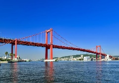 洞海湾を横断し、若松区と戸畑区を結ぶ長さ627mの吊り橋。赤い躯体が特徴で、国の重要文化財に指定されている。国内最初の本格的長大吊橋であり、1962年の開通当時は中央径間の長さが東洋一を誇った。若松側の海岸通りには、赤煉瓦造りでルネサンス様式を基調とした「北九州市旧古河鉱業ビル」をはじめとしたレトロな建物が立ち並ぶ。ライトアップされた橋は、「日本夜景遺産」に認定されており、週末を中心に「夜景観賞定期クルーズ」も運航している。戸畑側にある大橋公園から、雄大な若戸大橋を望むことができる。