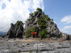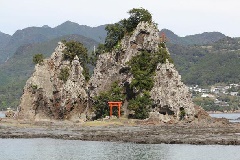 夏は海水浴客でにぎわうブルービーチ那智に面した、那智湾に浮かぶ小島。赤い鳥居が目印で、財運の神・白蛇弁財天が祀られている。干潮時になると岩肌が現れ、歩いて渡ることもできる隠れたパワースポットとなっている。太平洋から昇る朝日とともに、眺めるのもおすすめ。天気が良ければ、はるか彼方に那智御滝を望むこともできる。