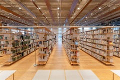 富山市の中心市街地に位置する複合施設「TOYAMAキラリ」の中にある図書館。建物の北半分には富山市立図書館本館、南半分には富山市ガラス美術館が入居している。絵本や児童書、主題書など子ども向けの本が充実した3階の児童図書フロア、約500タイトルが揃う雑誌コーナーなどがあり、蔵書は約45万冊。建築家・隈研吾氏が設計を手掛けた建物には、富山県産の杉材がふんだんに使われており、ガラスと木が織りなす吹き抜けの開放的な空間で、心地の良い時間を過ごすことができる。