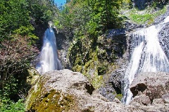 米子川源流、四阿山の北麓の懸崖に並んでかかる不動滝(落差85m)と権現滝(落差…